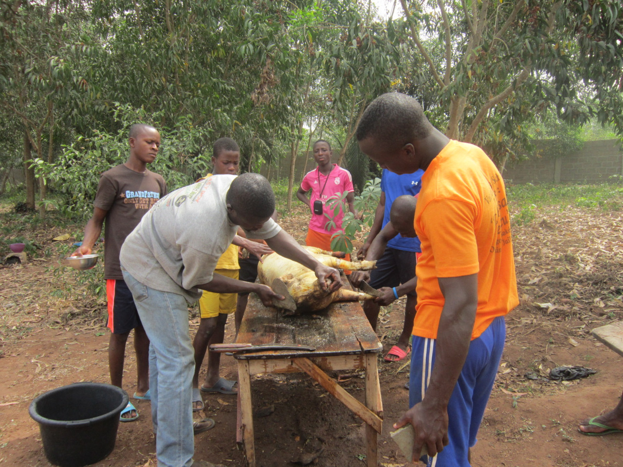 Le repas de fête hier, n’était naturellement pas du foie gras, ni du jambon à l’os encore moins de la fondue chinoise. Mais du cochon pur-nature fait maison. Les pensionnaires de l’orphelinat ne sont pas faits prier pour mettre à terre la bête avant une boucherie en plein air. Le viande passée à la casserole, a fait le festin du beau monde à l’orphelinat de Sakété. « Le soir, nous avons chanté aux enfants de l’orphelinat des chants classiques de Noël que nous leur avons appris. Chacun de nous avait une bougie dans la main » affirme Jean-Marc, responsable de la délégation Arbre de vie Suisse.